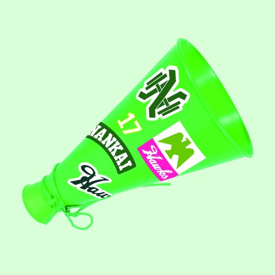 オリジナルステッカーでつくるミニメガホン ワークショップロゴマークや切り文字のステッカーを選んで貼り付け、ミニメガホンが完成。