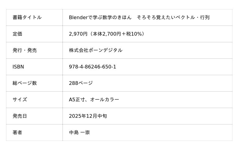株式会社ボーンデジタル(本社:東京都千代田区、CEO:新 和也、URL:https://www.borndigital.co.jp)は、『Blenderで学ぶ数学のきほん そろそろ覚えたいベクトル・行列』(著:中島 一崇)を2025年12月中旬に発売いたします。