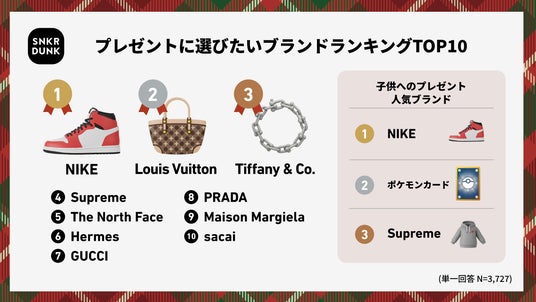 「クリスマスプレゼントを特定のブランドで探している場合、どんなブランドにする予定ですか?」という質問を元にランキング化したところ、最も多かったのは「ナイキ」でした。2位は「ルイ・ヴィトン」、3位「ティファニー」と、人気のハイブランドとジュエリーブランドがTOP3にランクインしています。ほかにも、「エルメス」「グッチ」「プラダ」など人気ハイブランドのほか、「シュプリーム」「メゾン マルジェラ」「サカイ」などスニダンにおけるファッショントレンドも、ランキングから伺える結果となりました。