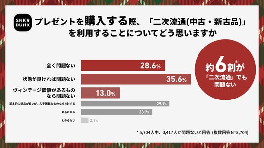 プレゼントを購入する際、二次流通(中古・新古品)を利用することについて質問したところ、28.6%「全く問題ない」、35.6%が「状態がよければ問題ない」と回答。また、13%が「ヴィンテージ価値があるものなら問題ない」、29.9%が「入手困難なものなら検討する」と回答し、回答者の約6割が「二次流通でも問題ない」と考えていることがわかりました。価値のあるモノや人気のアイテムなど一次流通での入手が困難なモノを手に入れる手段として、二次流通を活用している人が多いことが伺えます。