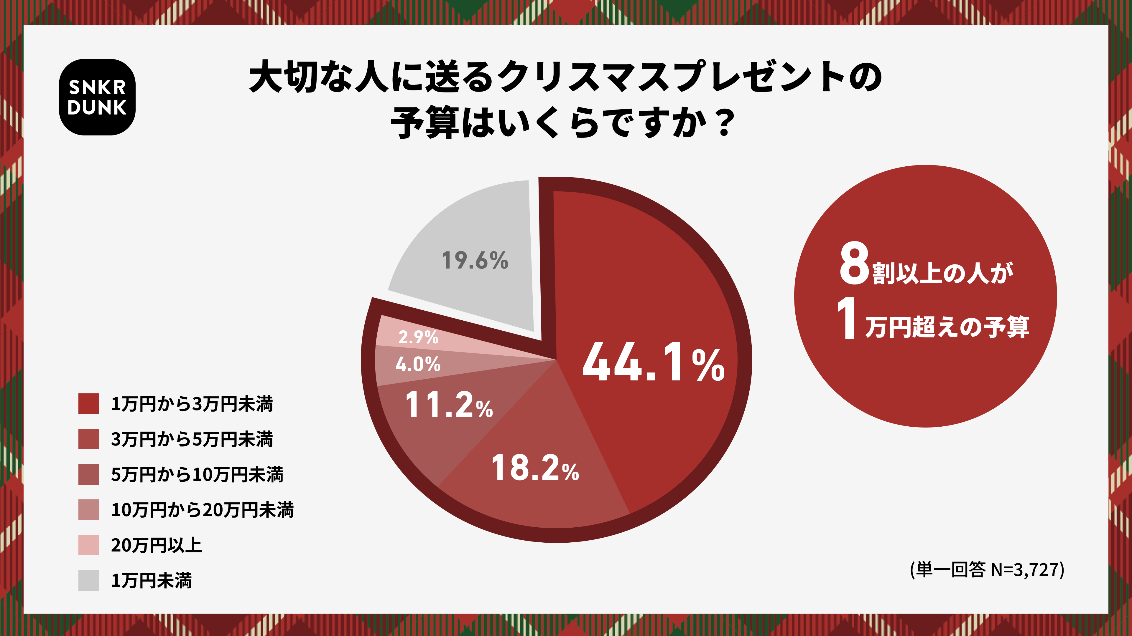 また、わたす予定があるクリスマスプレゼントの予算については、8割以上が1万円以上と回答。