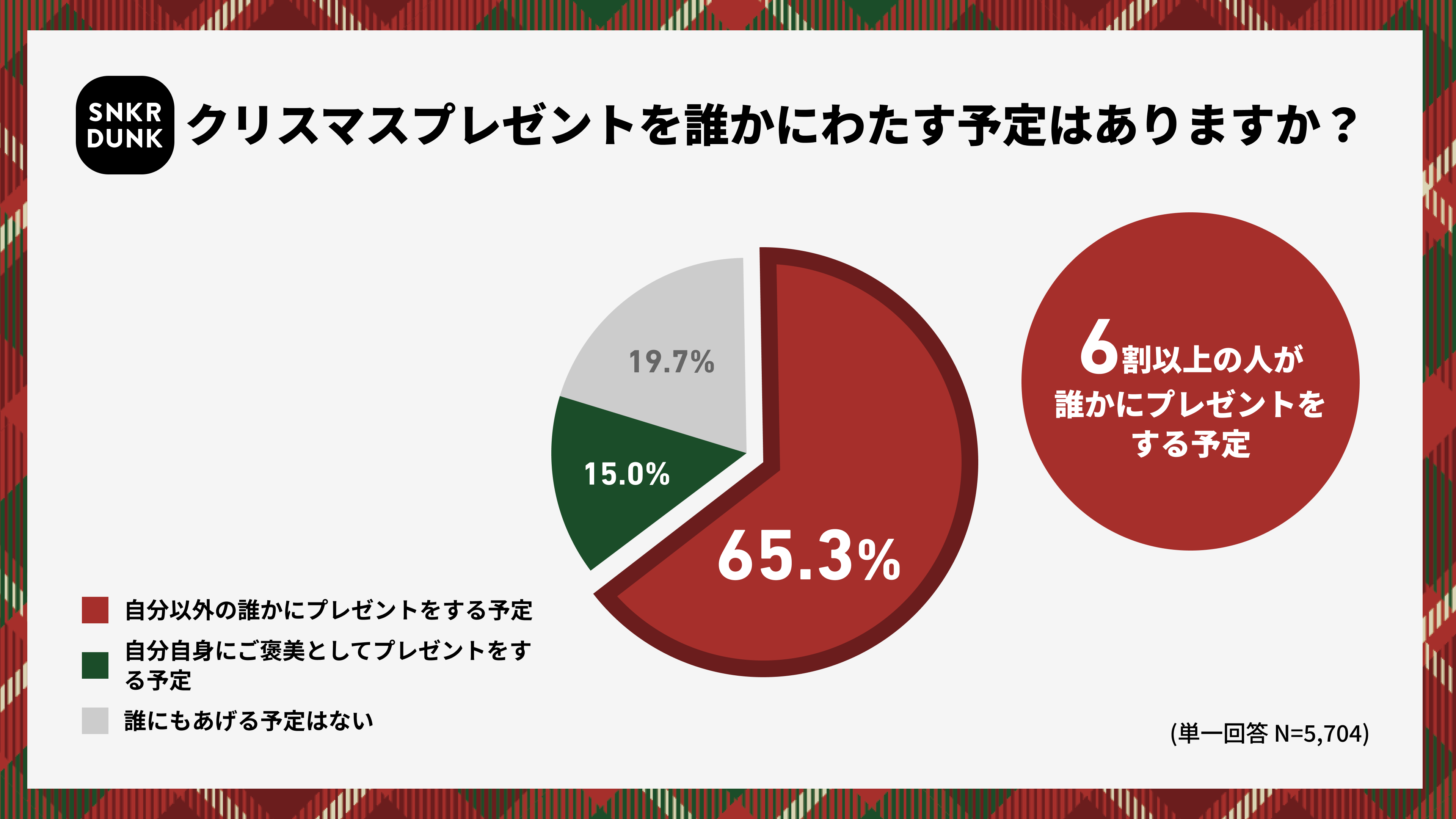 今年のクリスマスプレゼントを、自分以外の誰かにわたす予定があると回答した人は65.3%となりました。