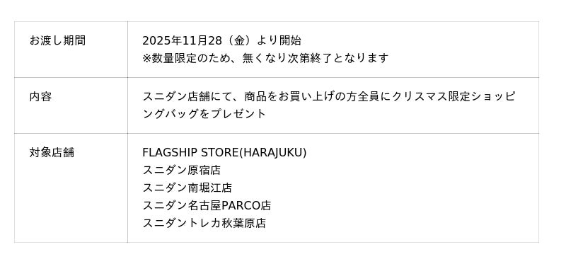 11月28日(金)から、スニダンの各店舗にて商品をお買い上げの方全員にクリスマス限定ショッピングバッグをプレゼントします。クリスマスギフトのプレゼントにぴったりな、心躍るホリデーシーズンならではの特別デザインです。数量限定となりますので、お早めにご来店ください。