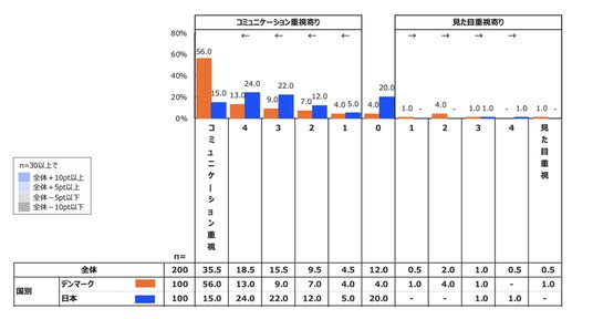 将来、ご自身が聞こえづらくなった場合に補聴器を検討する際、「コミュニケーションのしやすさ」と「周囲からの見た目」のどちらを優先したいかという質問において、2カ国間で明確な違いが見られました。デンマークでは、56%が「コミュニケーション重視」(スコア5)を選択したことから、補聴器に対してはコミュニケーション機能を重視する傾向が強いことがわかります。一方、日本で「コミュニケーション重視」(スコア5)を選択したのは15%に留まりました。補聴器を検討することがコミュニケーションの改善に強く結びついている傾向が強いデンマークに対して、日本はコミュニケーションが最重要とは限らず、スケールも「5・4・3・2・1・0」と分散していることからも、人により意識にばらつきがあることが読み取れます。