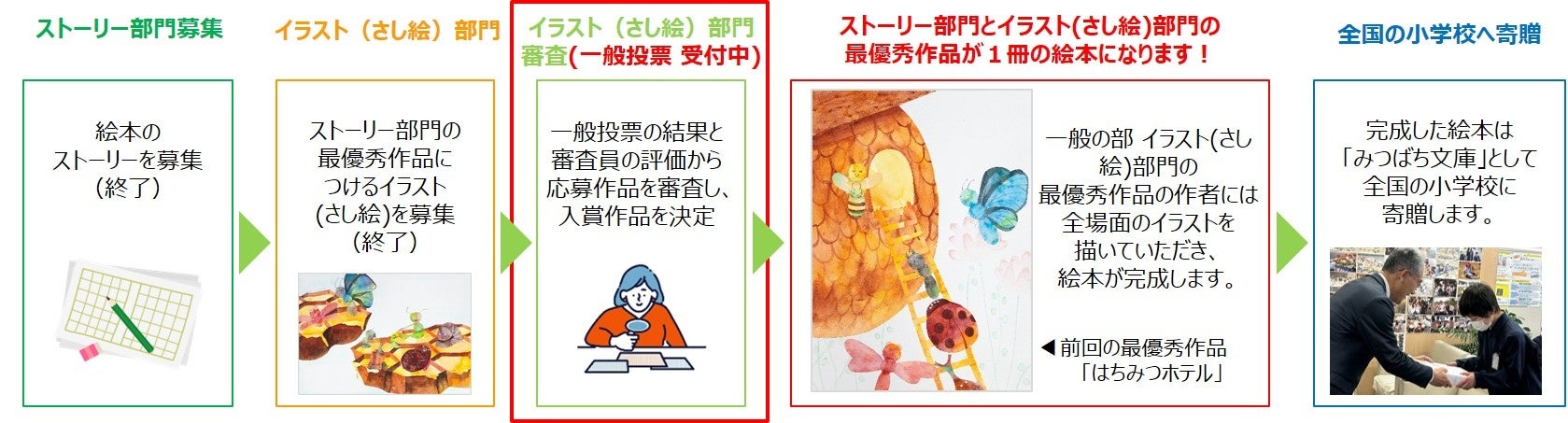 最終選考16点のさし絵作品はいずれも、本年度の最優秀ストーリー作品をもとに制作されたものです。一般投票の結果と審査員評価を総合的に判断し、最優秀賞を決定します。一般の部で最優秀賞に選ばれた作品は絵本化され、当社の社会貢献活動の一つである書籍寄贈活動「みつばち文庫」を通じて全国の小学校へ寄贈される予定です。