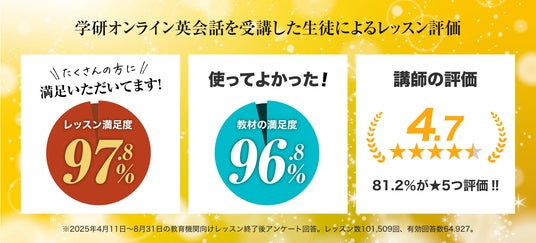 株式会社 学研ホールディングス(東京・品川/代表取締役社長:宮原博昭)のグループ会社で、教育機関向けオンライン英会話サービス「学研オンライン英会話 for School」を提供している株式会社 Glats(東京・品川/代表取締役社長:杉原聡)は、2025年4月11日から8月31日の約5ヶ月間にわたり、自社のサービスに関する顧客満足度調査を実施いたしました。その結果、レッスン満足度97.8%、教材満足度96.8%、講師評価平均4.7(5点満点)と非常に高い評価を獲得しており、教育機関でもそのサービスにご満足いただいていることが明らかになりました。