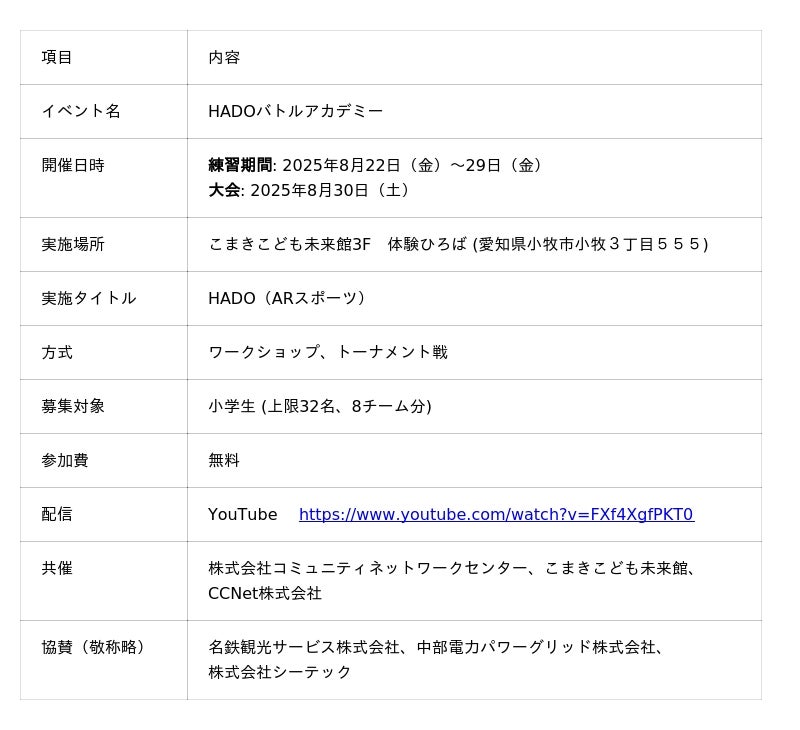 株式会社コミュニティネットワークセンター(本社:名古屋市東区、代表取締役社長:吉田和弘 以下「CNCI」)は、最新のAR(拡張現実)技術を活用したテクノスポーツ「HADO」で、未来を担う子どもたちの「創造力」「協働力」「適応力」「主体性」を育む活用パッケージ「HADOバトルアカデミー」の提案を11月27日より開始しました。