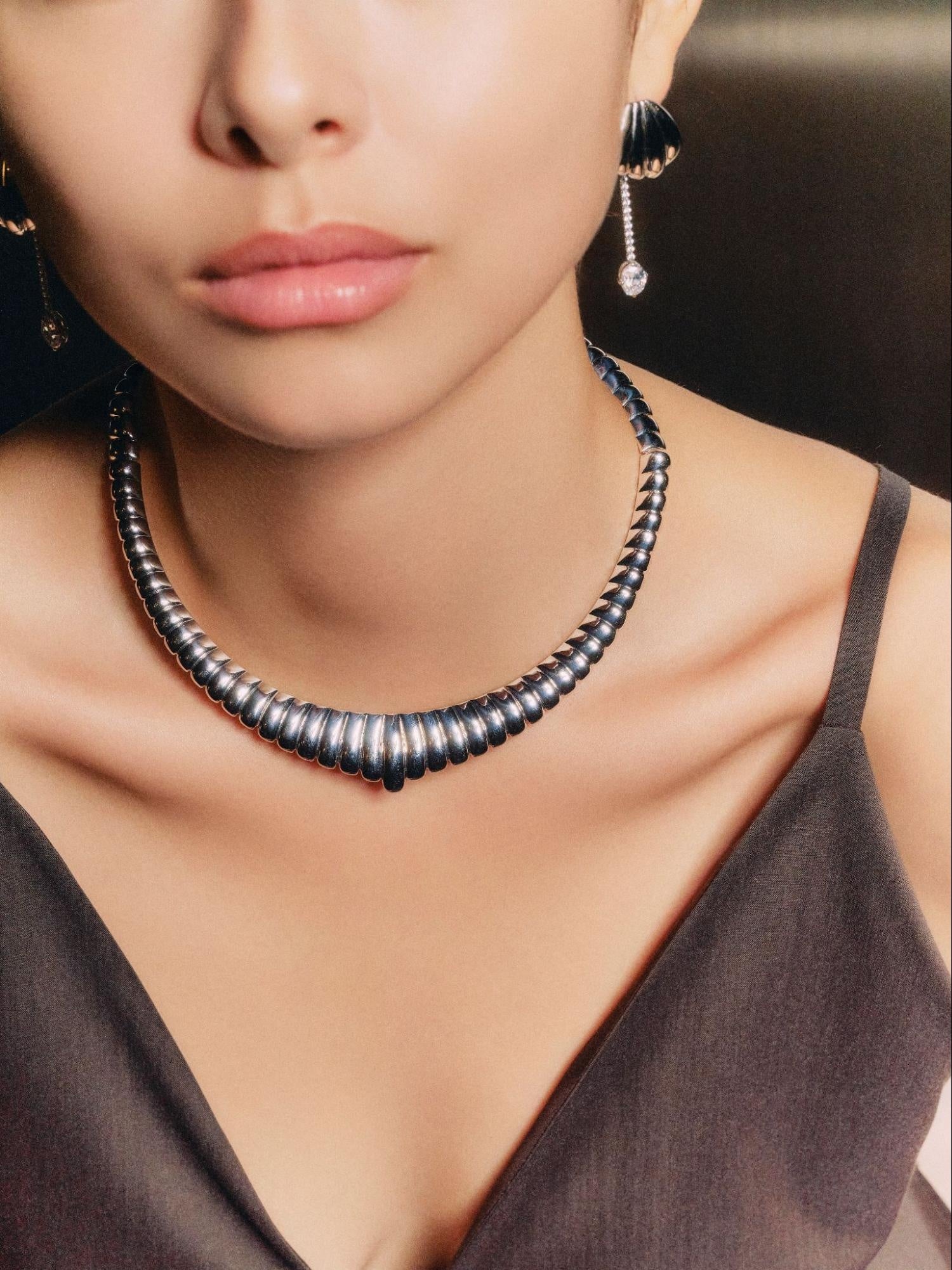 ラインナップは、ネックレス、ピアス、バングル、リングの4アイテムを展開。セットでつけても一つずつつけても存在感とニュアンスのどちらも生み出します。