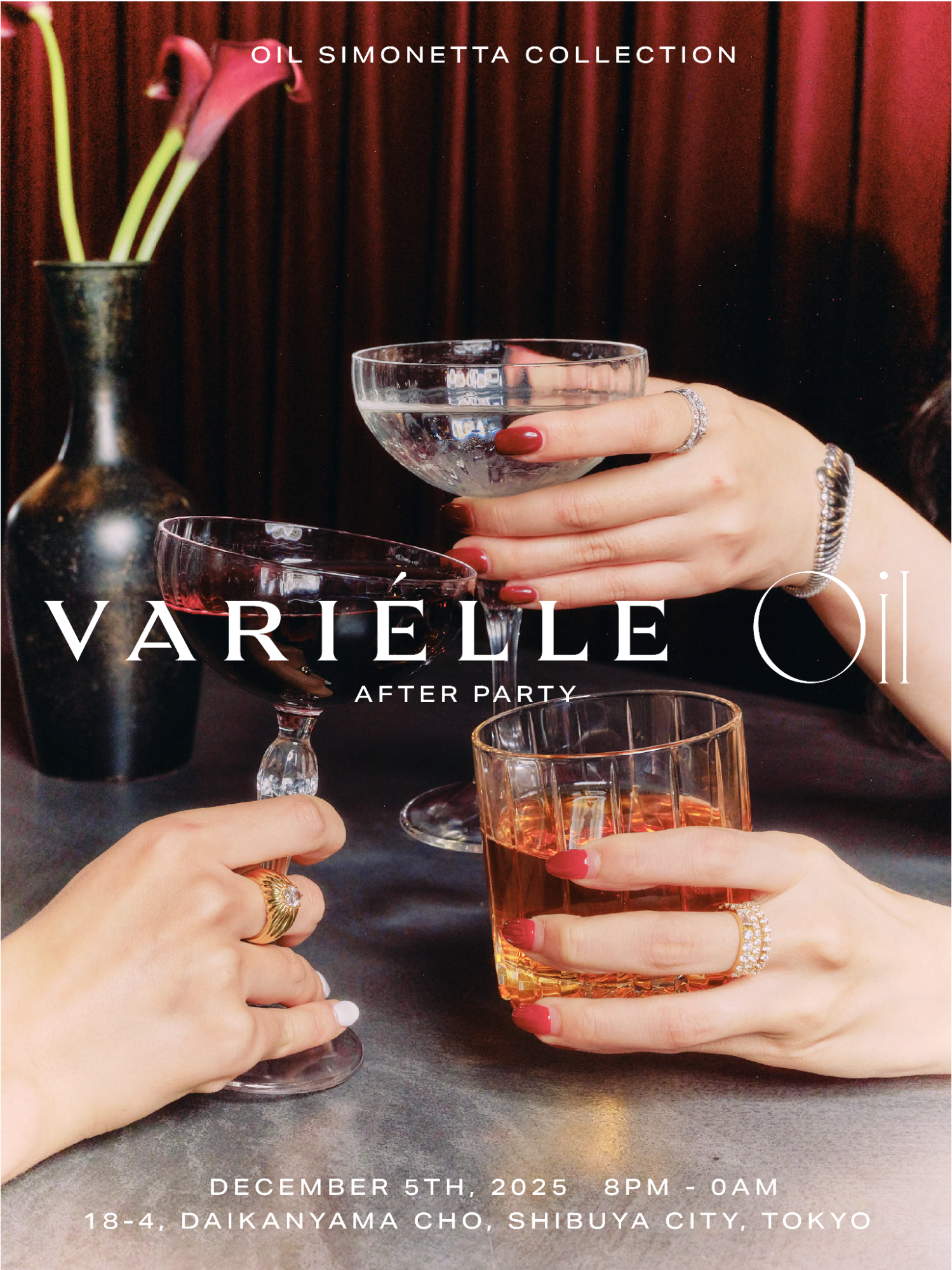 初日12月5日(金)の20:00からは、会場の雰囲気を一変させたアフターパーティを開催。パーティーシーンで一段と輝くVARIELLEジュエリーを着用した、東京のパーティシーンを牽引するDJによるスペシャルパフォーマンスに加え、夜のムードに合わせた演出も実施。「Oil」が幻想的なラウンジ空間へと変貌し、クリエイティブな感性が刺激される一夜をお届けします。