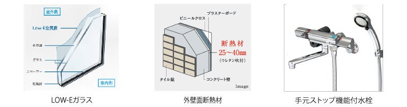 本物件は、「ZEH-M Oriented」認証を取得しています。ZEH-M Orientedとは、高い断熱性能と高効率な設備システムにより、快適な室内環境を維持しながら、マンション全体の年間一次エネルギー消費量を20%以上削減することを目指すものです。省エネ性と断熱性向上のため、「LOW-Eガラス」や「外壁面断熱材」、節水効果のある「手元ストップ機能付水栓」も導入しています。