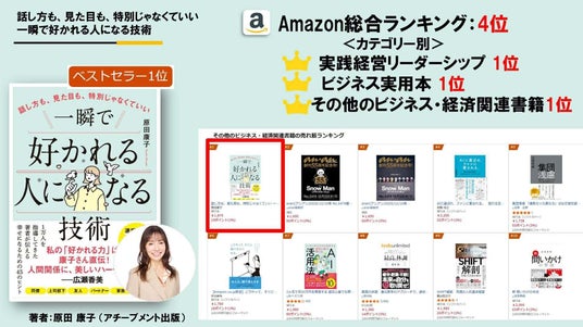 一般財団法人日本プロスピーカー協会顧問、エグゼクティブプロスピーカーの原田康子氏による初の著書『話し方も、見た目も、特別じゃなくていい 一瞬で好かれる人になる技術』が11月29日(土)に発売されます。本書は発売前に、増刷が決定し1万部を突破。Amazonランキング総合4位・3部門で1位と、発売前より数多くの先行予約をいただいております。