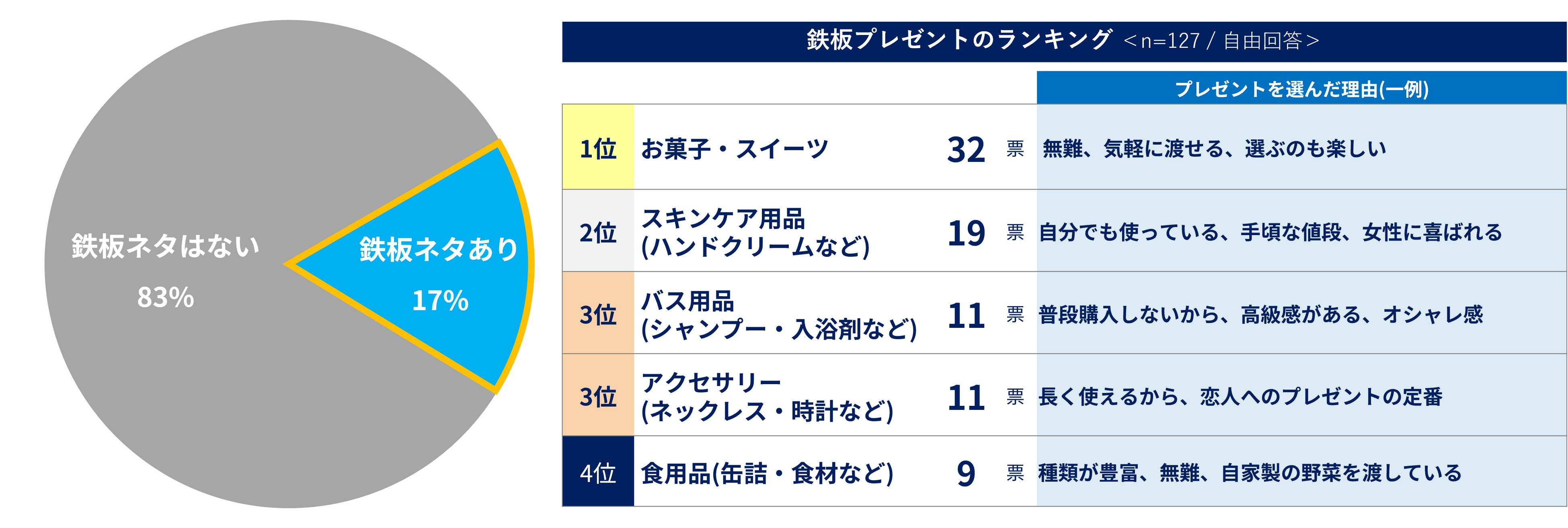友人、同僚、恋人に贈るプレゼントの鉄板ネタを聞いたところ、全体の17%の方が鉄板ネタを持っていることが分かりました。鉄板ネタのプレゼントでは「お菓子・スイーツ」(32票)が最も多くプレゼントとしての無難さや、気軽さを理由として挙げています。2位には「スキンケア用品」が選ばれハンドクリームや、ハンドソープなど普段から愛用していて相手にもオススメしたい製品をプレゼントしているようです。