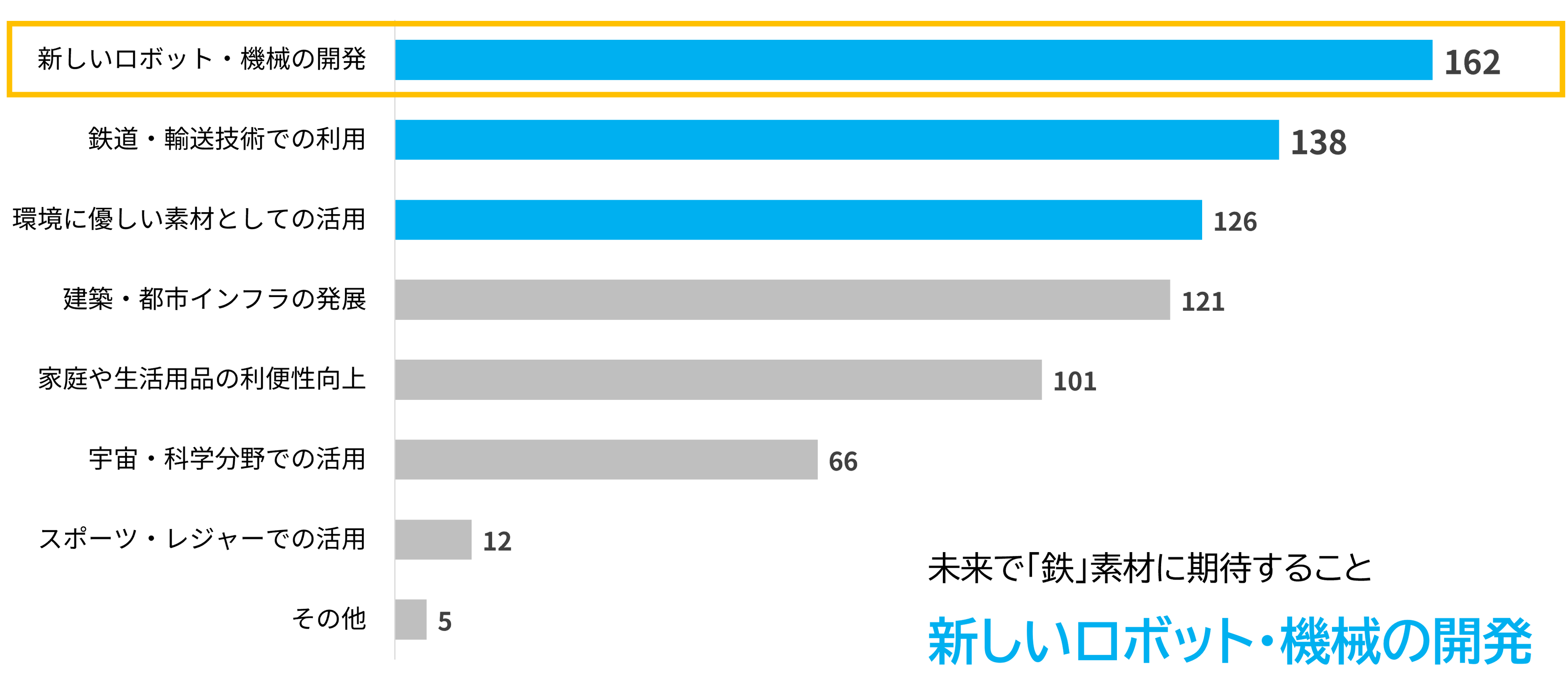 未来で鉄素材に期待することを聞く質問では「新しいロボット・機械の開発」(162票)が最も多い結果となりました。続いて「鉄道・輸送技術での利用」「環境に優しい素材としての活用」が挙げられており、交通インフラや、環境問題に関心が集まっているようです。
