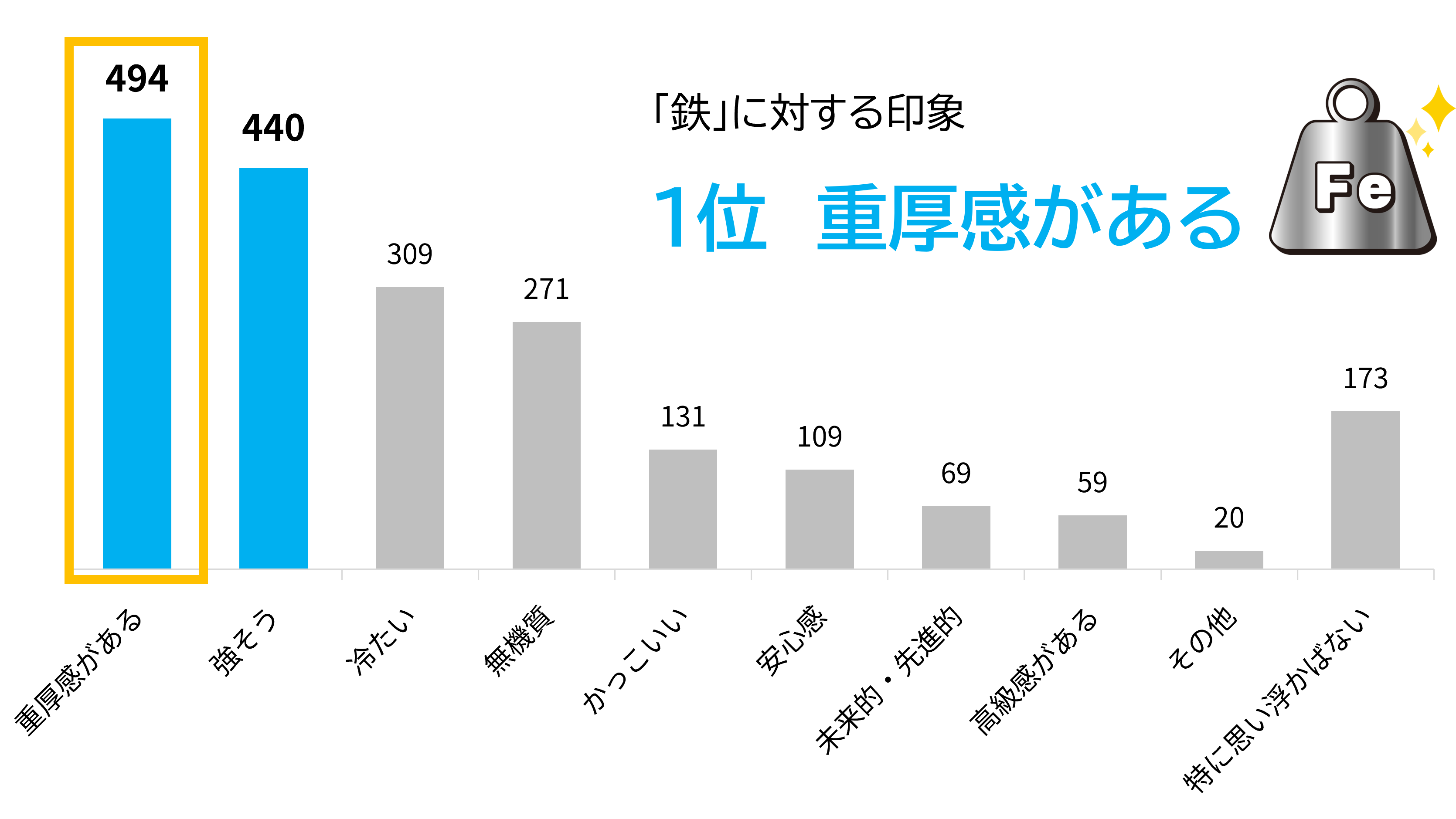 鉄に対する印象を聞く質問では、「重厚感がある」「強そう」が上位にランクイン。鉄は重量があり頑丈な印象が強い金属素材ですが、昨今では技術進歩により軽量化も進んでおり、強度を保ちつつ軽量な鉄素材も増えています。