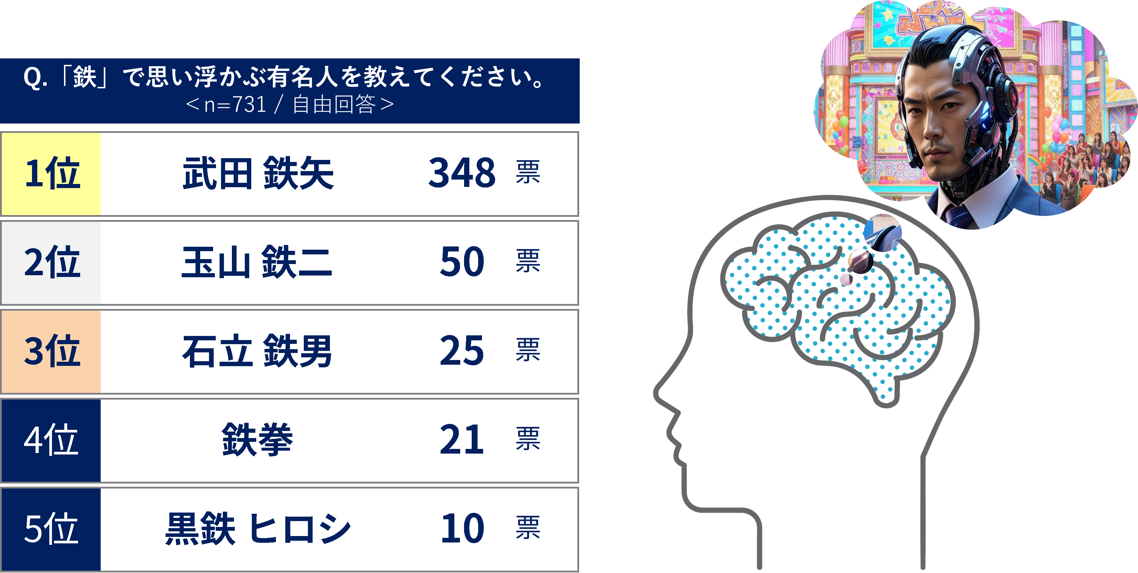 “鉄”で思い浮かぶ有名人を聞く質問では、俳優や歌手など長きにわたってマルチな活躍を続ける「武田 鉄矢」さんが過半数の票を得て1位(348票)に。2位には実力派俳優の「玉山 鉄二」さん、3位には昭和を代表する名俳優である「石立 鉄男」さんがランクインしています。