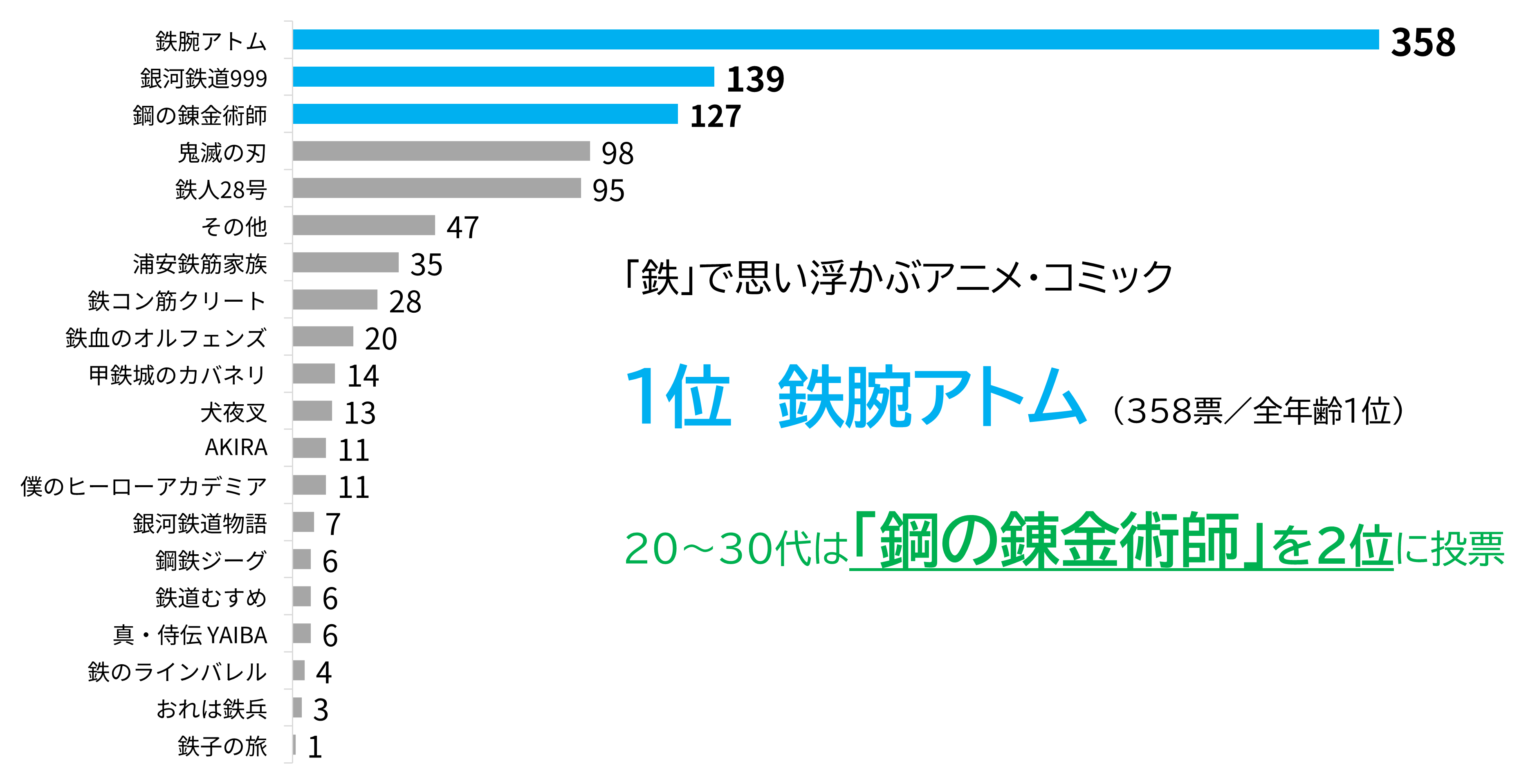 “鉄”と聞いて思い浮かぶアニメ・コミックを聞いたところ、ロボットアニメとして絶大な人気を誇る「鉄腕アトム」が全年齢で1位(358票)となりました2位には「銀河鉄道999」(139票)、3位には「鋼の錬金術師」(127票)がランクインし、20~30代の世代別ランキングでは「鋼の錬金術師」が2位にランクインしています。タイトルに「鉄」が入っていない作品ではキャラクター名や、ストーリーから「鉄」を想起する人が一定数いることが分かりました。