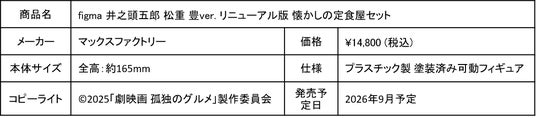 株式会社ホビーサーチ(東京都文京区)は、マックスファクトリーの『figma 井之頭五郎 松重 豊ver. リニューアル版 懐かしの定食屋セット』 (2026年9月発売予定)の予約受付を開始しましたことをお知らせいたします。
