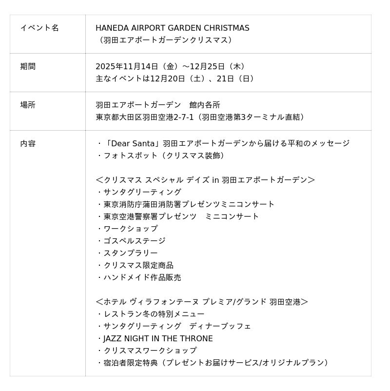 住友不動産商業マネジメント株式会社(本社:東京都新宿区/代表取締役社長:山本 直人)が運営する、羽田空港第3ターミナル直結の複合施設「羽田エアポートガーデン」では、クリスマスイベントを開催いたします。