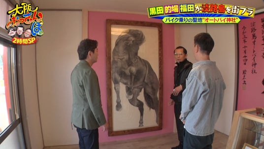 実は「淡路島オートバイ神社」に、馬の絵専門のアーティストである黒田の妻が、来年の干支・馬の絵を奉納したという。その迫力に「すごいね……!」と感動する的場と福田。
