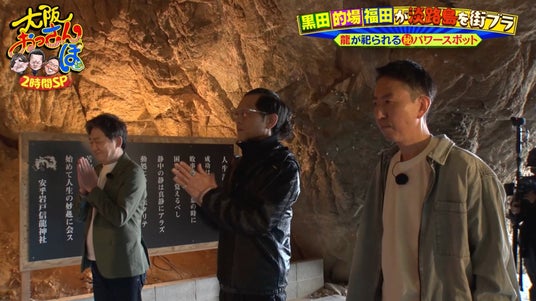 黒田が釣ったハマチを別荘で調理する前に、淡路島をおっさんぽ。まずは淡路島のパワースポット「安乎岩戸信龍神社(あいがいわどしんりゅうじんじゃ)」へお参り。実は神社仏閣が大好きという的場のために、もうひとつの神社へ案内する。