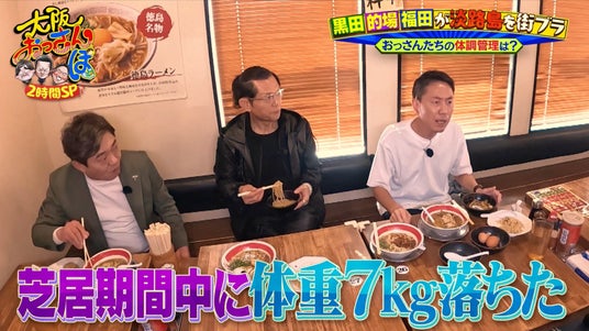 ラーメンを味わいながら的場の食生活を深掘り。俳優として活躍する的場は普段から食事に気を使っているといい、舞台が始まると節制。体調を崩さないために、毎日同じものを食べるそうで、先日も舞台公演中に体重が7kgも落ちたそう。徹底した体調管理を聞き、「ストイックやな~」と感心するふたり。
