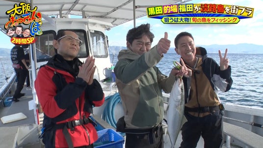 3人は、大物を狙う釣法「飲ませ釣り」に挑戦。あたりがないまま1時間以上経過するが、ついに黒田の竿にヒット! 立派なハマチを釣り上げ、的場と福田は「淡路の帝王!」「すばらしい!」と拍手喝采!