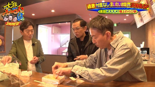 続いて、大のスイーツ好きである的場を、黒田が「今まで食べたわらび餅の中で一番うまい」と太鼓判を押す「高級芋菓子しみず」へご案内。わらび餅を味見した的場と福田は「やべぇ、溶ける!」「何この食感!」と大絶賛!