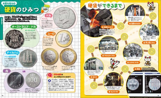 新紙幣のひみつやお金の誕生の歴史、硬貨ができるまでの様子やさまざまな職業の紹介、クラウドファンディングの仕組みなど、お金に関する学びに満ちた映像も一緒に楽しめます。DVD付きのお金図鑑は、本書だけ!(2025年11月時点/児童向け学習図鑑比較/講談社調べ)