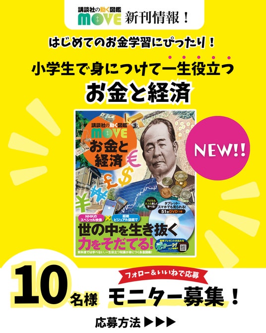 シリーズ累計600万部超の「講談社の動く図鑑MOVE」シリーズから、お金と経済をテーマにしたDVD付きお金図鑑『講談社の動く図鑑MOVE お金と経済』を2025年11月28日(火)に発売します。「世の中を生き抜く力をそだてる」をコンセプトに、子どもから大人まで、現代社会をサバイブするための知恵や知識を豊富に掲載した、実用的な図鑑です。