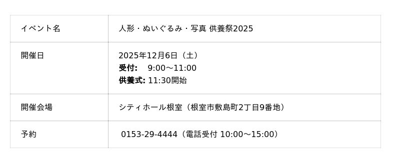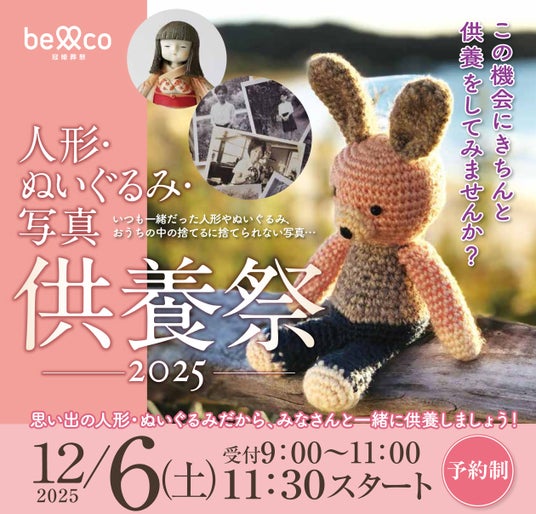 2025年12月6日(土)、株式会社ベルコ(シティホール根室)は、長年大切にしてきた人形・ぬいぐるみ・写真に感謝を込めて送り出す「人形・ぬいぐるみ・写真 供養祭2025」を開催いたします。本供養祭は予約制となっており、受付は当日9:00~11:00、供養式は11:30より執り行います。