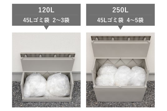 製品カラーのグレーとブラックはどちらも屋外に馴染みやすい色合いで、玄関横や軒下に置いても景観を損ないません。サイズは250Lと120Lの2サイズ。置き場所や用途によってお選びいただけます。