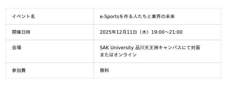 英国国立エセックス大学公認の国際教育提携校 SAK University東京イノベーションキャンパス(以下、SAK University)は、2025年12月11日(木)19時にLunaTone Inc.CEOのヒョン・バロ氏を招いた特別講演「e-Sportsを作る人たちと業界の未来」を開催します。