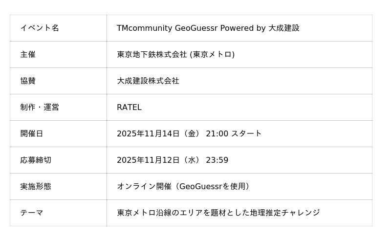 株式会社RATEL(本社:東京都渋谷区、代表取締役:吉本 砂月、以下「RATEL」)は、東京地下鉄株式会社(本社:東京都台東区、代表取締役社長:小坂 彰洋)が主催するオンラインイベント 「TMcommunity GeoGuessr Powered by 大成建設」 において、大会の制作・運営を担当することをお知らせいたします。