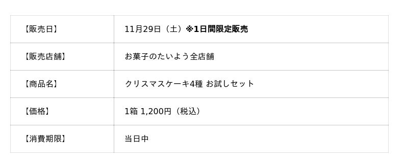 株式会社太陽社(所在地:千葉県匝瑳市飯倉293、代表取締役:片岡正裕)が展開する、千葉県で長年愛され続ける菓子店「お菓子のたいよう」では、クリスマス限定スイーツ第3弾として、クリスマス限定デコレーションケーキ全7種のうち、人気の4種を一度に味わえる『クリスマスケーキ4種 お試しセット』を 11月29日(土)・1日限定 で販売いたします。
