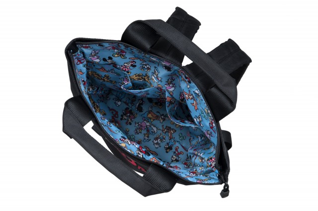 一見するとシンプルデザインのリュックですが、口を開くと、裏地には総柄のキャラクター達がお出迎え!