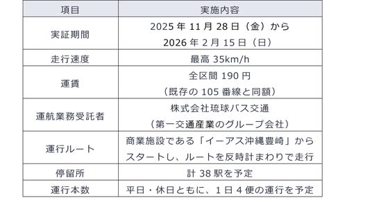 豊見城市(市長:徳元 次人)、第一交通産業株式会社(本社:福岡県北九州市、代表取締役社長:田中 亮一郎、以下「第一交通産業」)、日本電気株式会社(本社:東京都港区、取締役 代表執行役社長 兼 CEO:森田 隆之、以下「NEC」)、株式会社電脳交通(本社:徳島県徳島市、代表取締役:近藤 洋祐、以下「電脳交通」)、株式会社ティアフォー(本社:東京都品川区、代表取締役 執行役員 CEO:加藤 真平、以下「ティアフォー」)の5者は、豊見城市内で自動運転EVバスの有償運行を本日より開始します。自動運転EVバスは、豊見城市の生活路線である全長28.2kmの豊見城市内一周線(105番)のうち、約18kmの区間を対象に2026年2月15日(日)まで運行します。