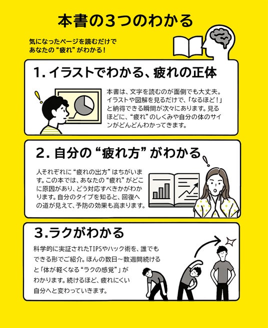 本書は、文字を読むのが面倒でも大丈夫。イラストや図解を見るだけで「なるほど!」と納得できる瞬間が次々にあります。見るほどに、“疲れ”のしくみや自分の体のサインがどんどんわかってきます。