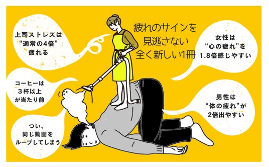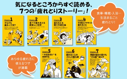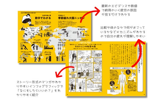 最新のエビデンスや数値にもとづく“疲れの原因”がひと目で理解でき、比較図や体内で起きているメカニズムがわかることで自分の疲れの正体が納得できる構成に。さらに、ストーリー形式のマンガや直感的なインフォグラフィックで「結局なにをしたらいいの?」を明快に示し、誰でも実践しやすい内容になっています。