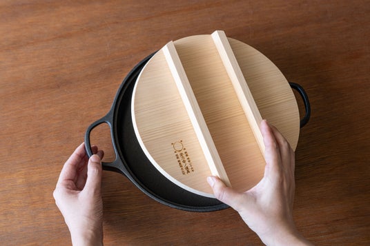 今回は、茅乃舎特注の国産椹(サワラ)材の木蓋もご用意しました。かぶせることで、対流熱を閉じ込めつつ余分な水分を逃がす構造になっています。焼き物はふっくら香ばしく仕上がり、鍋料理のアクも取れます。