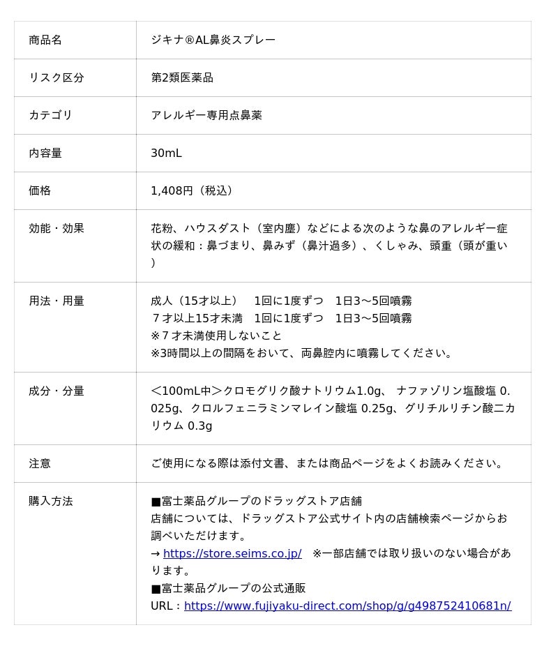 「ジキナ(R)AL鼻炎スプレー」は、「セイムス」をはじめとする富士薬品グループのドラッグストアおよび、富士薬品グループの公式通販でご購入いただけます。