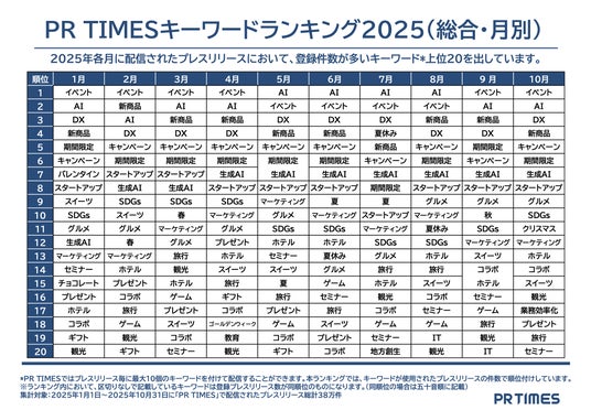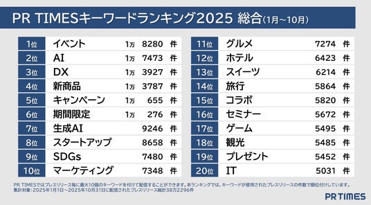 「PR TIMES」ではプレスリリース発表の際に、発表企業がプレスリリース内容に関係するキーワードを最大10個登録することができます。2025年1~10月に発表された総計38万2296件のプレスリリースのキーワード登録総数は46万7010種に上りました。件数による順位だけでなく、過去の件数との比較や月別の推移、キーワードごとの詳細な発表内容の分析から、2025年の企業活動の潮流や企業動向の変遷と流行の兆しをキーワードを通して分析しています。