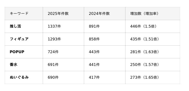 「推し活」が流行語として広く知られるようになった2021年末以降、企業発表で使用されるシーンも年々増えています。2021年:46件、2022年:312件、2023年:618件、2024年:891件。その勢いはとどまるどころか、新たな行動様式としてより一般的になっています。2025年も前年比+446件で1.5倍に増加しています。その対象や形式とともに、関連するキーワードも広がっており、「フィギュア」や「ぬいぐるみ」に加え、推し活対象をイメージしたという「香水」なども多く発売され、件数を伸ばしました。関連して、「ぬい活」のキーワードも2024年17件から53件と3.12倍に増加しています。