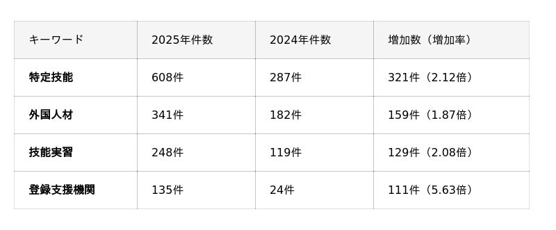 「特定技能」のキーワードは、在留資格制度が創設された2019年に徐々に登場し始め、2020年には前年比2.41倍の164件と増加したものの、以降は横ばいが続いていました。2019年:68件、2020年:164件、2021年:186件、2022年:199件、2023年:207件、2024年:287件。そんな中で2025年には前年比2.12倍の608件と増加した背景には、過去最高の在留外国人数(2025年6月時点、出入国管理庁より)で外国人労働者が増える中で、外国人材関連サービスが資金調達や、大企業による協業など、ビジネス界でも活発な動きが見られる影響と考えられます。多様な業界で、外国人材の働きやすさに着目した施策などの発信も見られています。こうした外国人材の受け入れをサポートする「登録支援機関」の発信も前年比5.63倍の135件と増えており、紹介事例や大手旅行会社が参画するといった発表もありました。