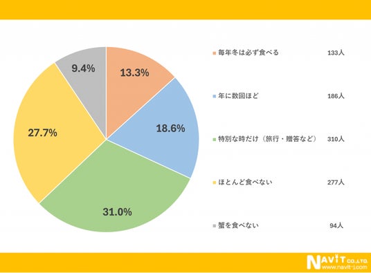 蟹を食べる機会についてのアンケートでは、「特別な時だけ(旅行・贈答など)」が1番多く31.1%で、「年に数回ほど」が18.6%で続くという結果になりました。ちなみに筆者は年に1回程度食べます。
