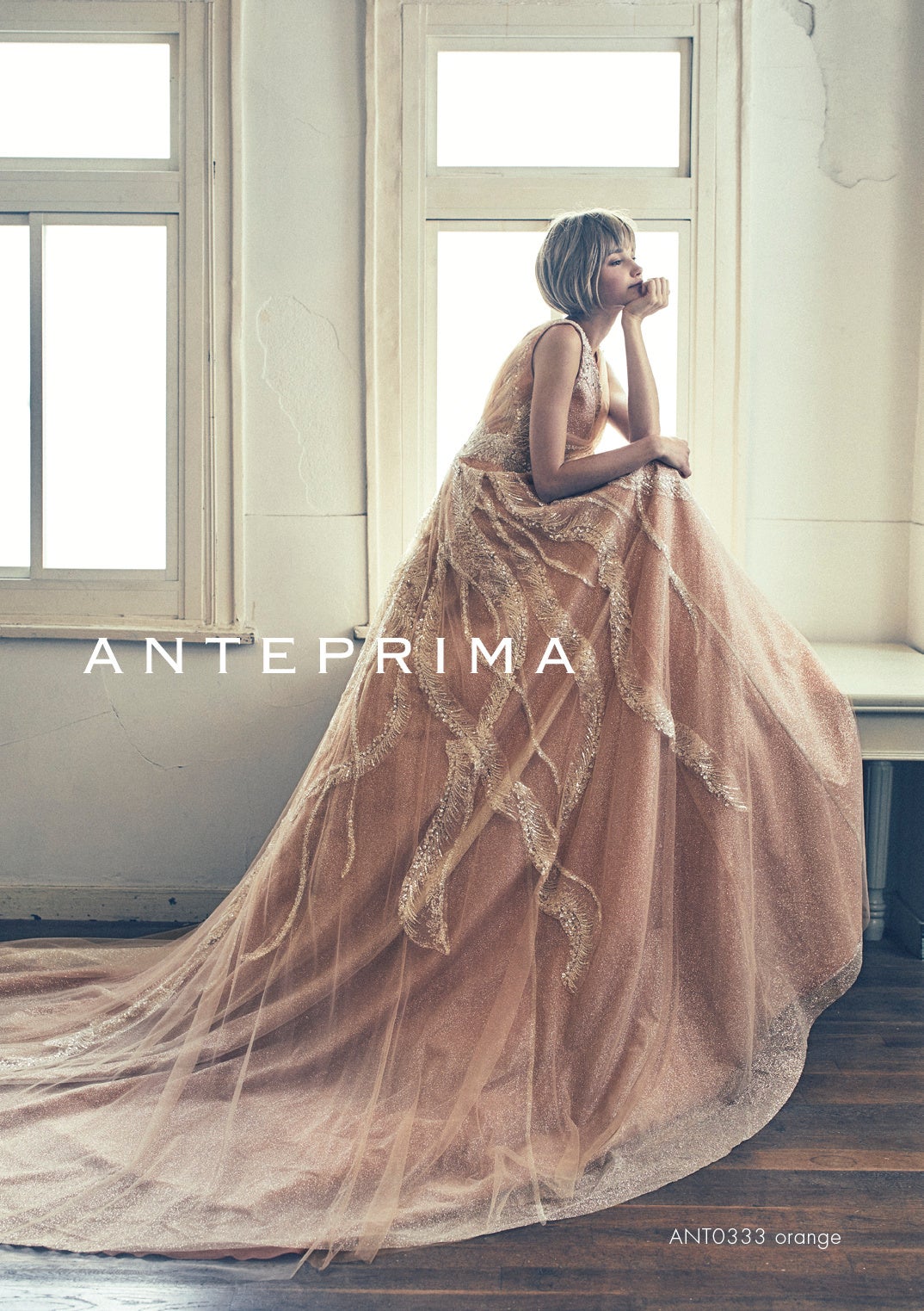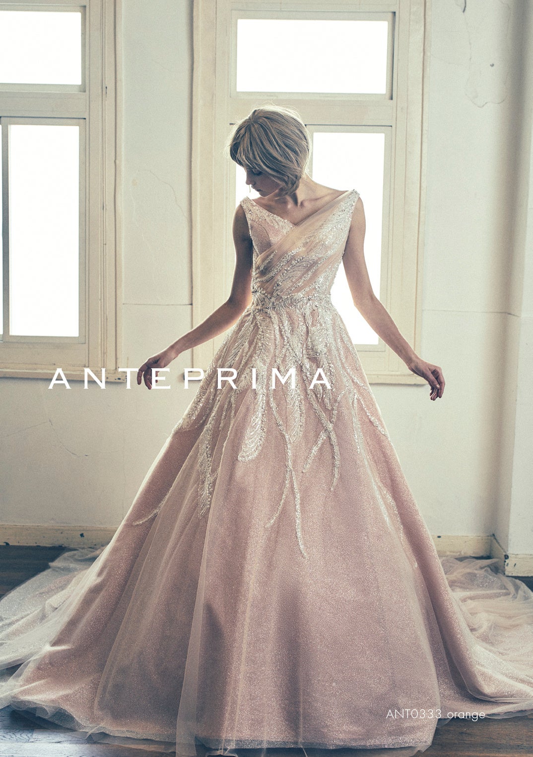 柔らかなスモーキーカラーを取り入れて、今どきのトレンド感を演出。控えめでありながらも洗練されたこのカラーは、ウェディングシーンに新しい風を吹き込みます。フォトジェニックな輝きを取り入れたデザインが今後の主流となり、アンテプリマのスタイルにぴったりフィット。どの角度から見ても美しいビジューレースが、動くたびにキラキラと輝く、渾身のシャイニーオレンジドレスです。