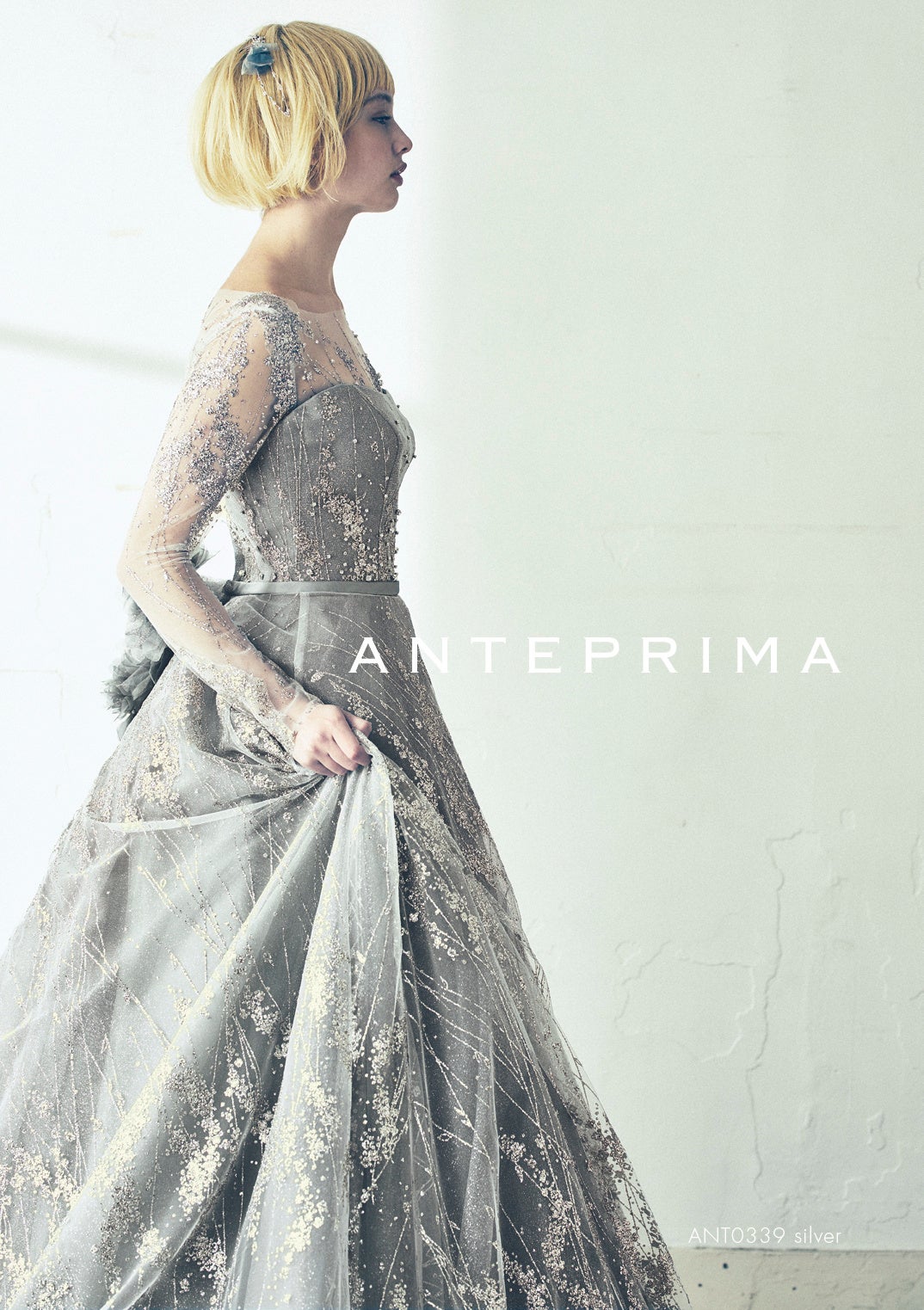 アンテプリマで不動の人気’シルバー”。こちらのコレクションでは、シルバーにほんのりグレージュをプラスし、トレンド感を取り入れつつ、色の幅を広げました。華美すぎず、絶妙な輝きのオリジナルグリッターには、ANTEPRIMAフィオーリを巧みにレイアウトして、ブランドの個性を際立たせています。さらに、取り外し可能なロングスリーブ付きのヨークが肌を美しく包み、透明感を演出。同素材で作られたコサージュは自由にアレンジ可能です。