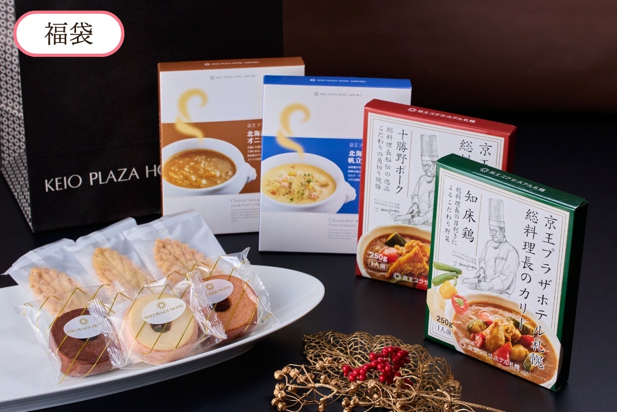 お正月イベントを盛り上げる福袋を数量限定で販売いたします。中身は、ホテルオリジナルのレトルトカリーや焼き菓子など、総額7,200円相当の商品が詰まっており、大変お得な内容となっております。<内容> レトルトスープ&カリー、バウムクーヘン、リーフパイ、フィナンシェバー 合計7,200円相当