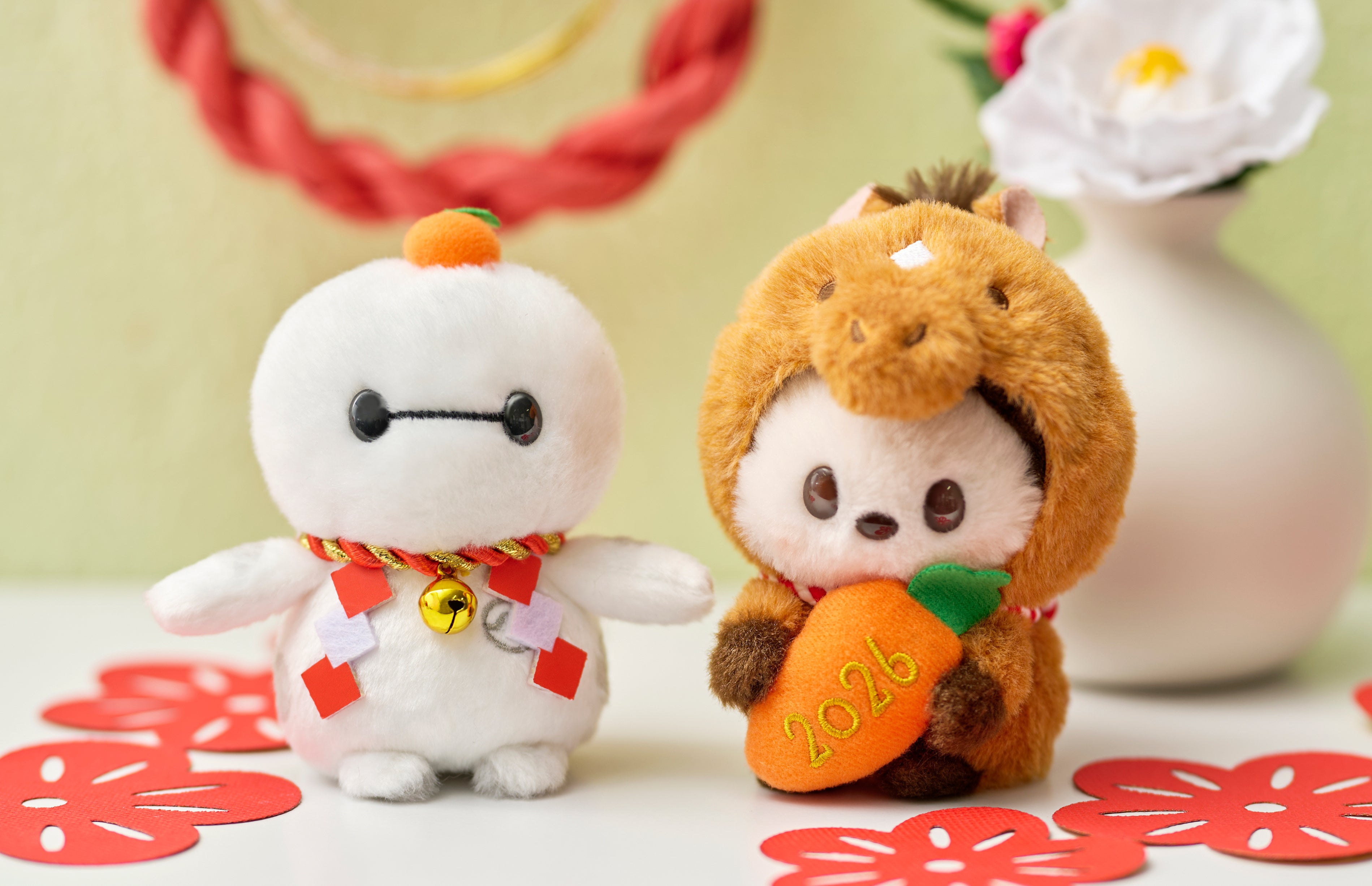 「うるぽちゃちゃん」から、お正月らしい装いがキュートなミッキーとベイマックスのぬいぐるみが登場します。ミッキーは2026年の干支にちなんだ、うまコスチュームに身を包み、“2026”の刺しゅうが入ったにんじんを抱えて特別感あふれるデザインに。ベイマックスは頭に橙をのせた鏡餅風スタイルで、組紐や鈴、紅白飾りなどをあしらったお正月ムード満点のデザインです。