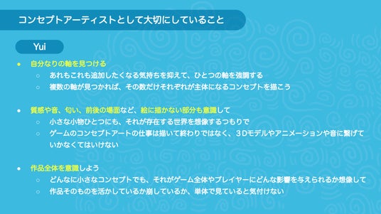 その後も、各アイテムについて「かかりちょう」氏が思い描いたイメージと実際のビジュアルが適切に結びついているか、絵のタッチの細部に至るまで丁寧なフィードバックが続けられました。さらに終盤では、田邊・藤原に加え、thatgamecompanyで働く他のメンバーから寄せられたコメントも紹介され、デザイン数の多さやクオリティの高さに対する好意的な意見が相次ぎました。その上で、実装を見据えた際に必要となる視点や考え方についてのアドバイスも共有されました。