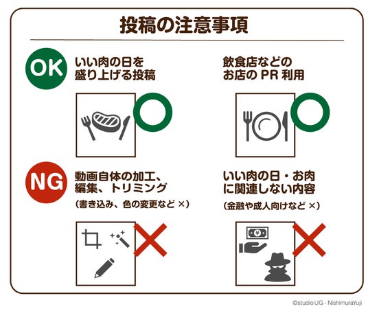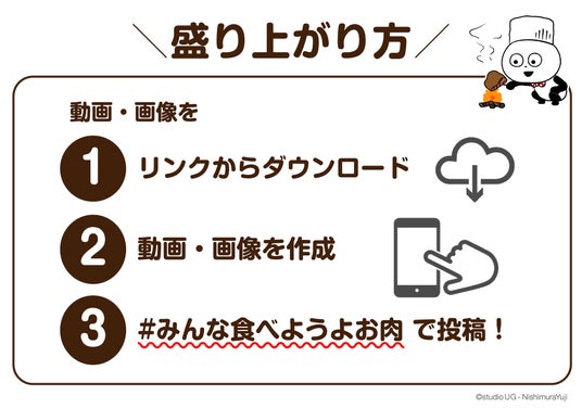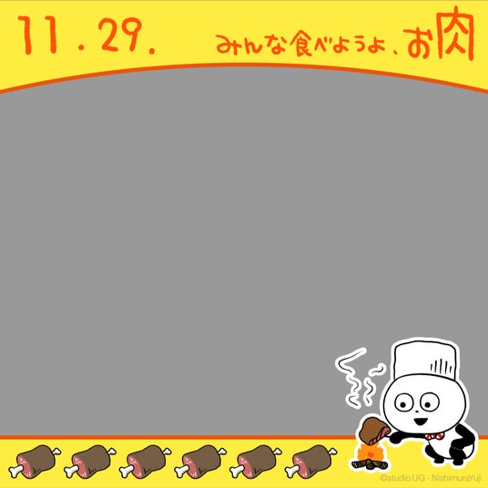 studio UG株式会社(本社:東京都杉並区、代表取締役:にしむらゆうじ・相川 美希)は、11月29日の「いい肉の日」に向けたSNS企画「#みんな食べようよお肉」を実施しました。本プロジェクトは、にしむらゆうじが勝手に宣伝したい物を宣伝する「スタジオUG独断コマーシャル企画部」の第1弾で、肉をこよなく愛するにしむらゆうじが、「いい肉の日」にお肉の存在を宣伝すべく始めた企画です。にしむらゆうじが制作したアニメ動画やフレーム画像を無料配布し、お肉にまつわる写真や動画と組み合わせて再配信できる、UGC(ユーザー生成コンテンツ)型の企画となります。